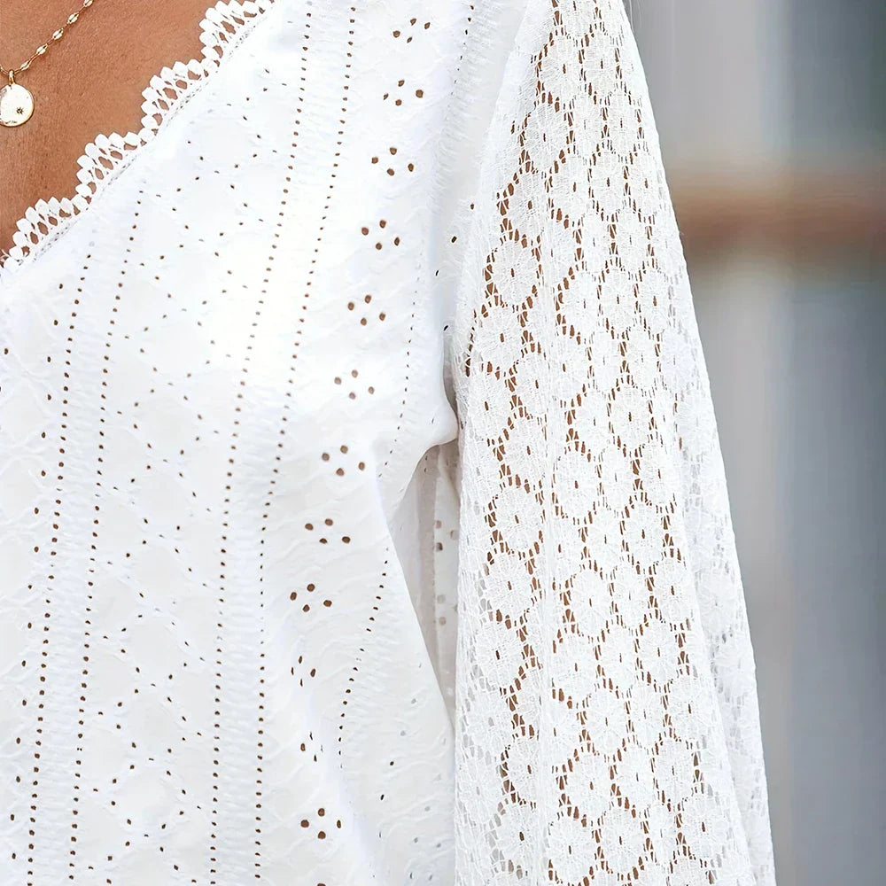 Elegantin V-pääntien ja kauniiden pitsikoristeiden ansiosta tämä pusero on täydellinen lisä vaatekaappiisi. Pitkät, puhvihihat pitsikuvioin antavat romanttisen ja naisellisen ilmeen, ja kevyt ja ilmava kangas tekee siitä ihanteellisen lämpimiin päiviin.